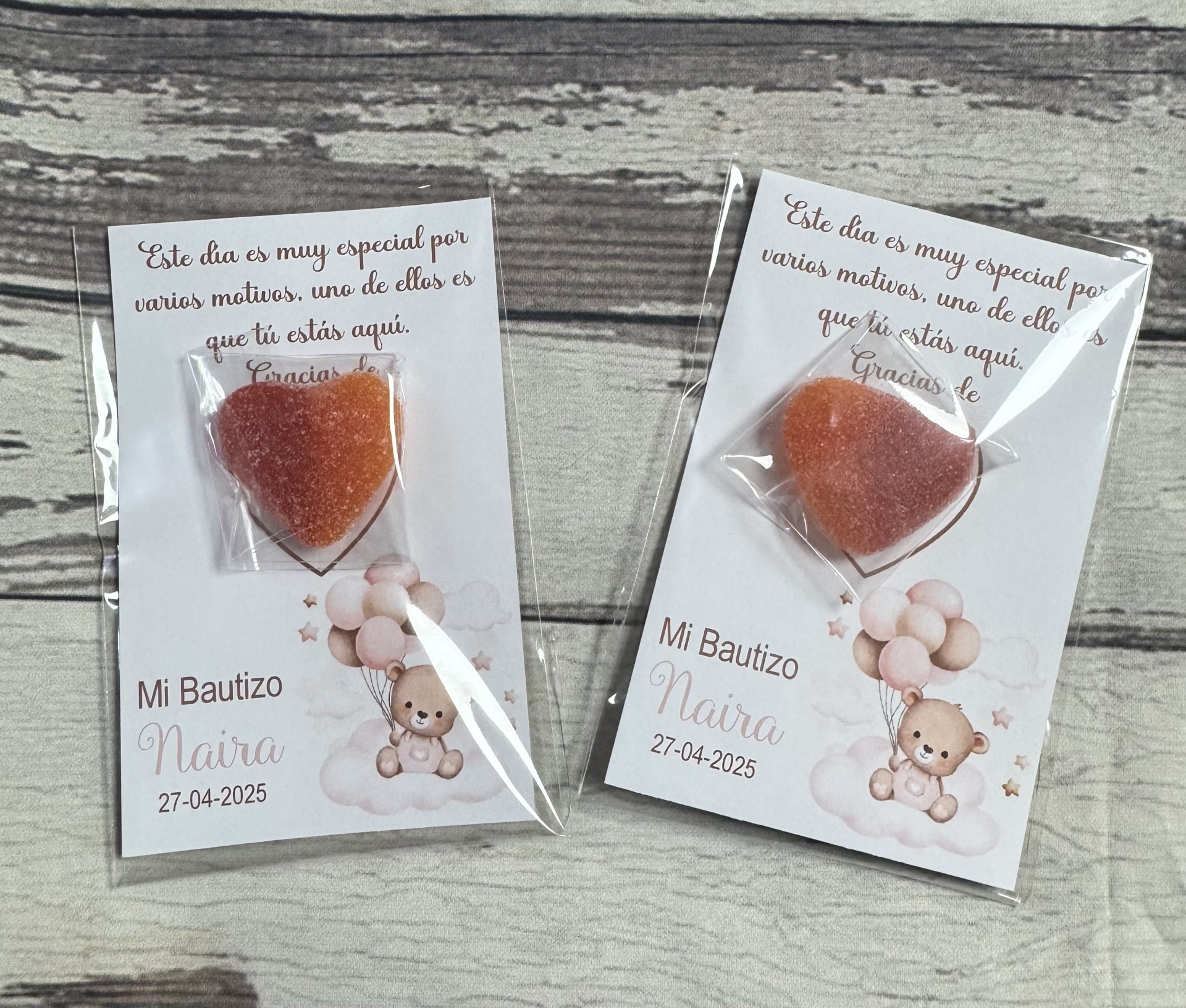 Incluye gominola con forma de corazón empaquetada en bolsita de celofán transparente