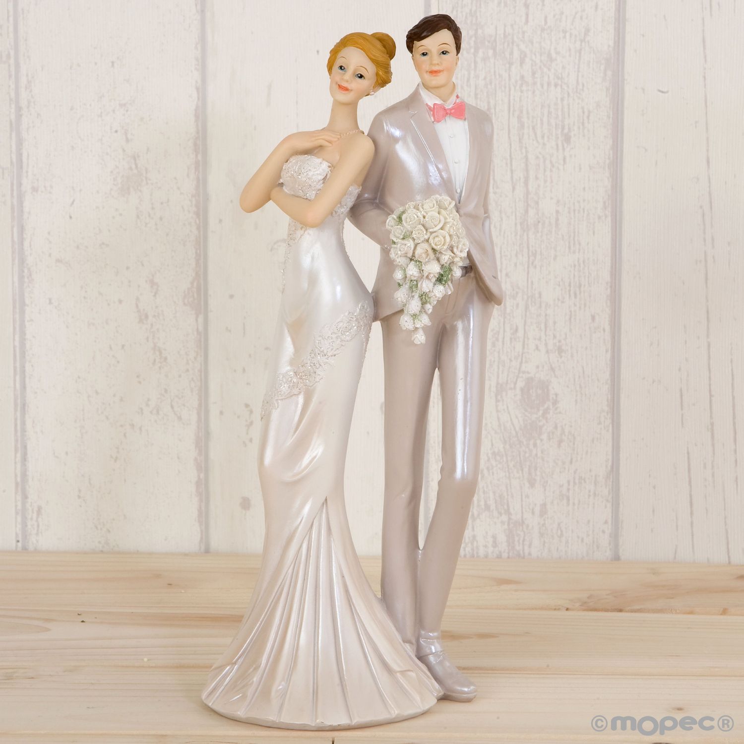 Figura de 25cm. para tarta de boda donde los protagonistas van vestidos con elegantes trajes.En tono nacarado de las figuras combina con cualquier decoración. Perfecta para decorar la tarta en el momento de la celebración y como recuerdo después.