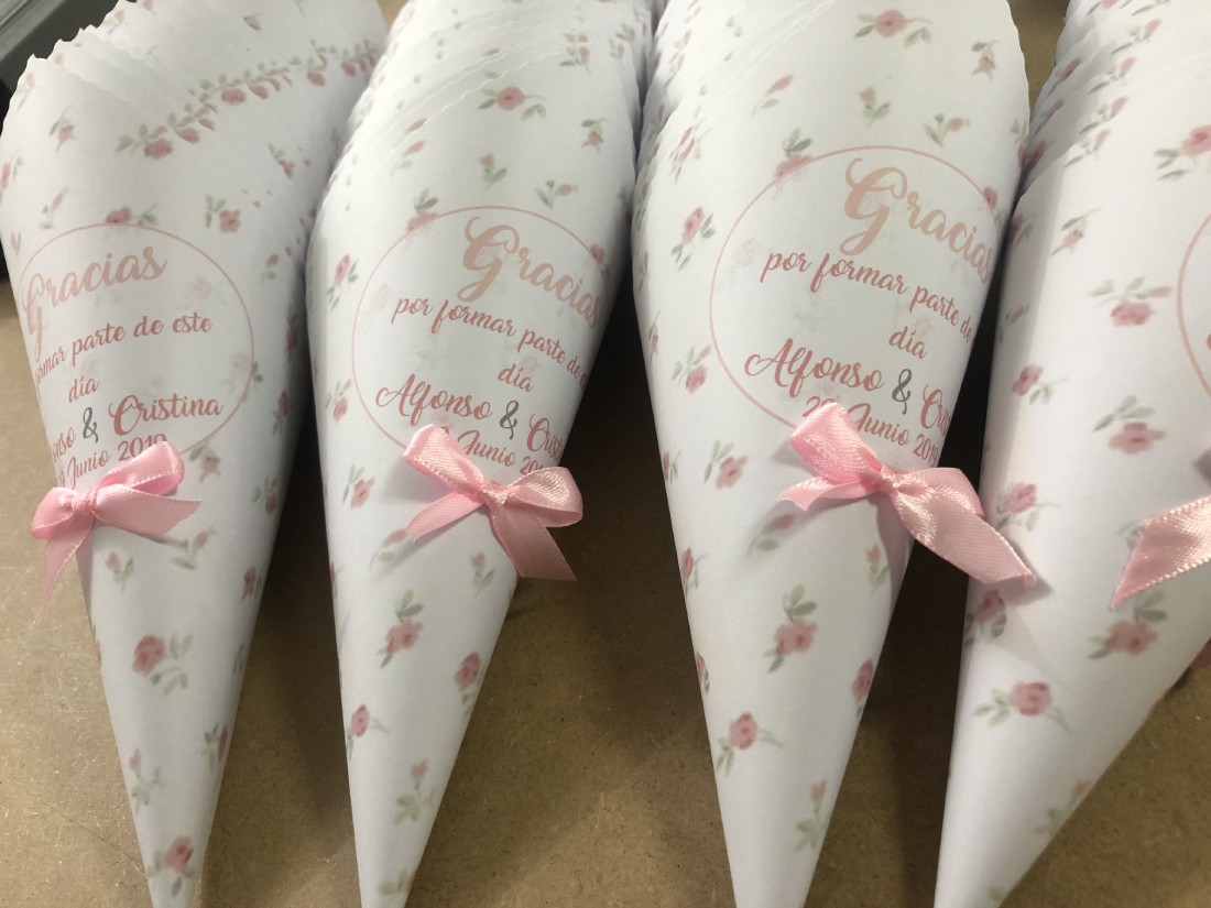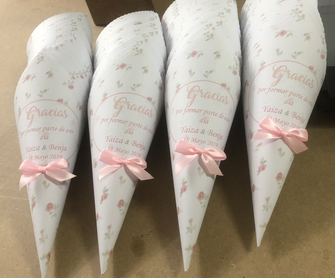 Puedes colocarlos en las sillas de los invitados, para que no se quede ninguno sin su cono o en una estantería o caja en la entrada del enlace.