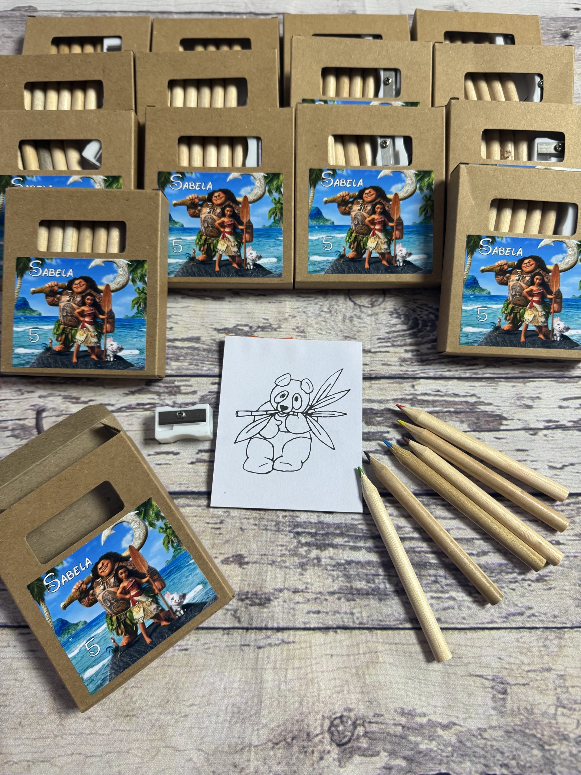 Contiene 6 lápices de colores, un sacapuntas y un bloc de hojas para colorear.