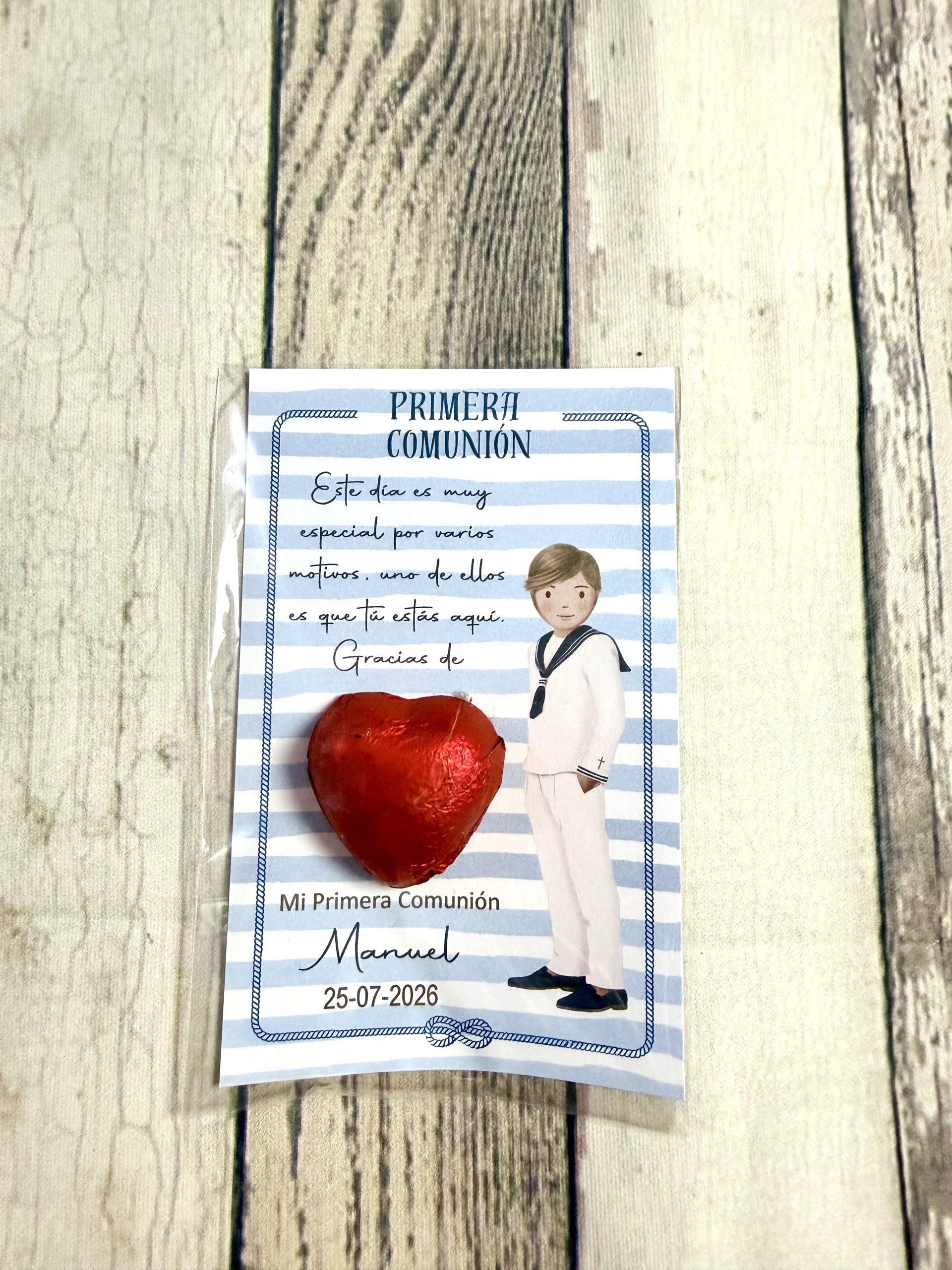 Tarjeta de agradecimiento con bombón azul niño marinero
