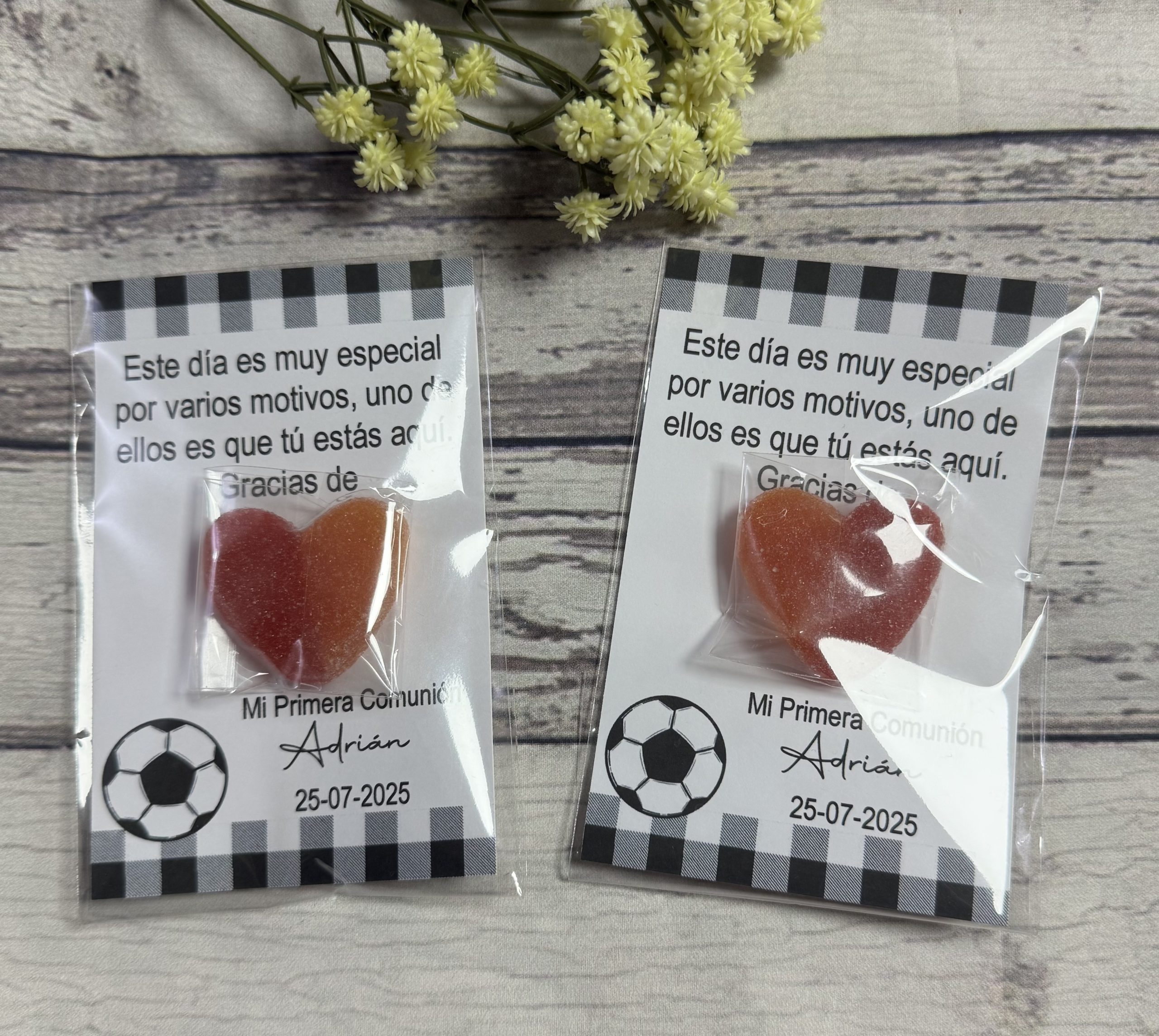 Tarjeta de agradecimiento con gominola cuadros vichy negros y pelota de fútbol