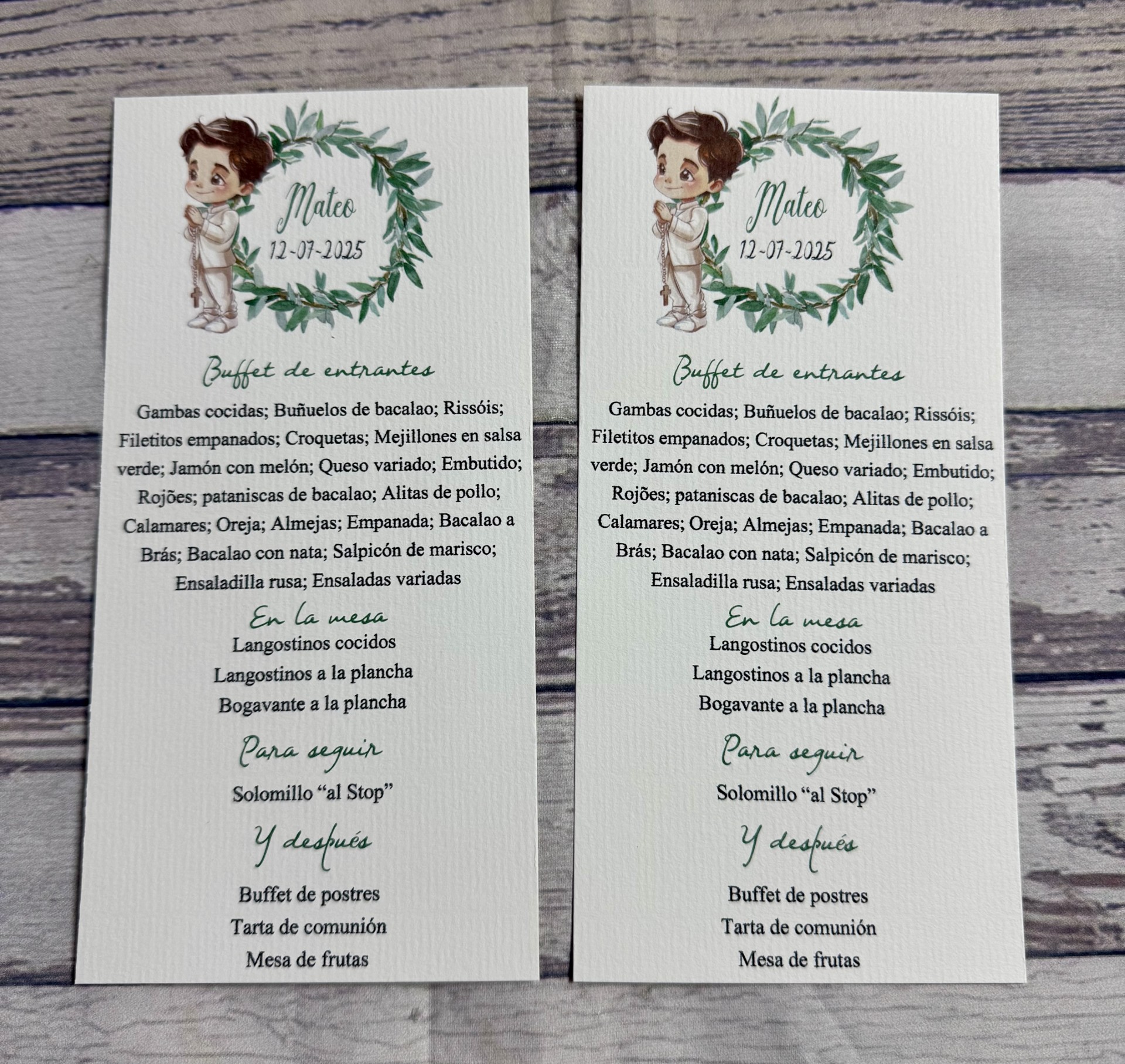 Informa del menú del banquete de comunión y se pone sobre el plato de cada invitado
